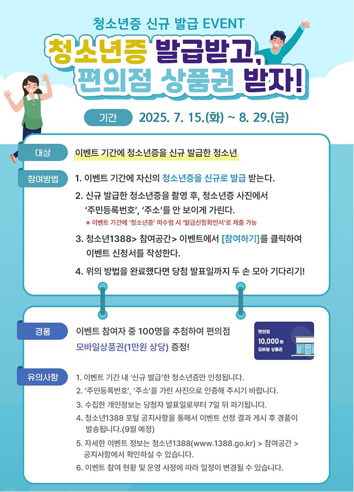 청소년들의 자립성과 편의성을 높여주는 청소년증. 주민등록증이 없는 만 9세 이상 18세 이하의 청소년들에게 신분증 기능을 제공하면서, 교통·문화·복지 혜택까지 누릴 수 있는 유용한 제도입니다. 그런데 올해는 여기에 ‘편의점 상품권’ 혜택까지 더해졌습니다. 청소년증을 새롭게 발급받고, 모바일 인증까지 완료하면 선착순으로 편의점 상품권을 받을 수 있는 특별 이벤트가 진행되고 있기 때문입니다.